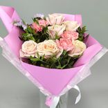 Букет из роз, гвоздик и статицы «Секрет сердца» — это тайный ключ к самым нежным и сокровенным чувствам. Розы, раскрывшиеся в мягких лепестках, напоминают о страстных признаниях, а гвоздики, с их бархатистой текстурой, добавляют загадочность, словно скрытый смысл в каждом слове. Статица, как магический акцент, придает композиции легкость и хрупкость, словно невидимая нить, соединяющая сердца. Этот букет — настоящая волшебная тайна, которая раскроется только тем, кто по-настоящему готов понять ее красоту.