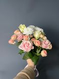 - Великолепие и гармония: сочетание роз, хризантем и гвоздик создает богатую и многослойную композицию.