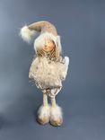 Забавная текстильная фигурка, исполненная в теплой коричнево-бежевой палитре. Персонаж одет в уютную зимнюю одежду с мягкими меховыми элементами и высокой шапкой бежевого цвета. Теплые оттенки и приятная фактура ткани создают очаровательный, домашний образ, в котором чувствуется забота и тепло.