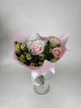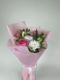 В ансамбль букета добавлена зеленая листва. Композиция упакована в крафт-бумагу розового оттенка.