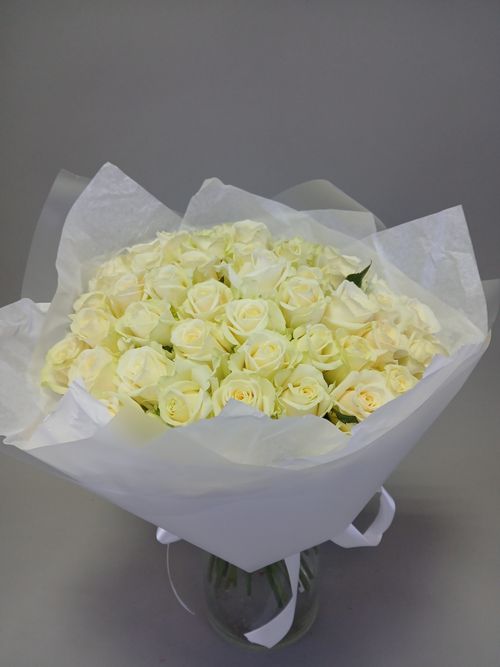Букет из 51 белой розы — дарят на юбилей, свадьбу, для признания в трепетном отношении или торжественного события. Белые розы универсальны, поскольку смотрятся как в классическом оформлении, так и в дизайнерской упаковке, а сама композиция выглядит статусно. Значение цвета - искренность, забота, нежность.