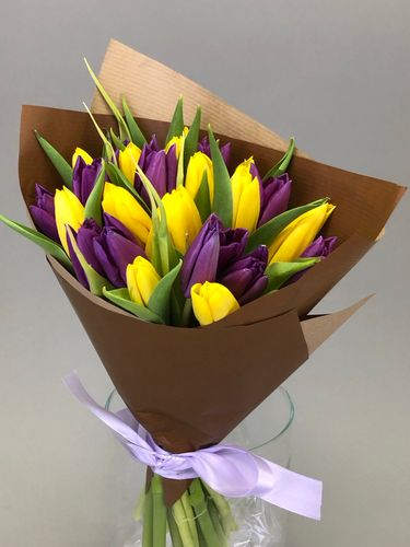 Дуэт из желтых тюльпанов и синих ирисов, оформленных в крафтовую бумагу, удивит яркими и насыщенными цветами. Этот букет символизирует весну, тепло и солнечное настроение. Подарок уместен как для женщин на 8 марта, так и для мужчин на 23 февраля, принося радость и поднимая настроение.