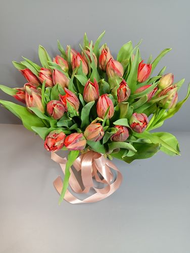 С добавлением зелени. Тюльпаны великолепно смотрятся в окружении зеленых веток и листьев, что придаёт композиции природный и свежий вид. Зелень смягчает насыщенный оттенок тюльпанов, делая букет более гармоничным и воздушным.