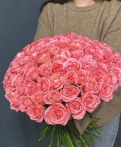 С практической стороны 101 роза позволяет флористу собрать плотную, равномерную композицию. Бутоны располагаются так, чтобы букет смотрелся круговым, без пустот и провалов, а стебли удобно фиксировались лентой или декоративной обвязкой. Получается правильная форма — пышная, но не громоздкая, поэтому подарок легко преподнести одним человеком.