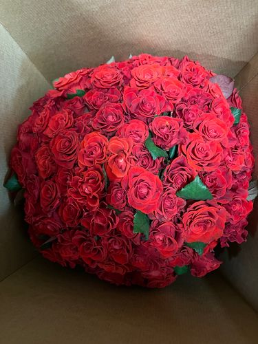 С практической стороны 101 роза позволяет флористу собрать плотную, равномерную композицию. Бутоны располагаются так, чтобы букет смотрелся круговым, без пустот и провалов, а стебли удобно фиксировались лентой или декоративной обвязкой. Получается правильная форма — пышная, но не громоздкая, поэтому подарок легко преподнести одним человеком.