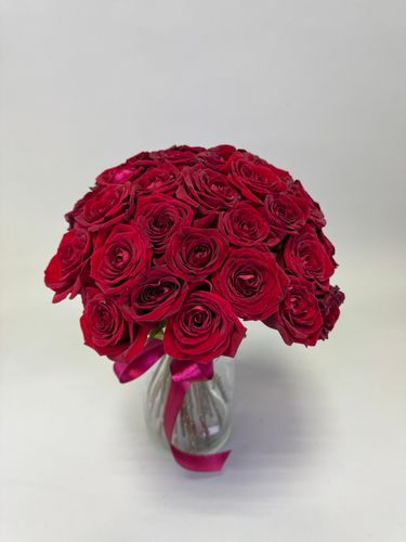 - Красные розы с зеленью — классика, которая особенно востребована для серьезных юбилеев, таких как серебряная или рубиновая свадьба.