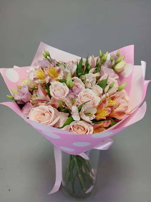 - Признание в любви или романтический жест. Розы — вечная классика для выражения чувств. Но если хочется добавить оригинальности, рекомендуем смешанные букеты. Например, микс из роз и астильбы смотрится необычно и трогательно. Или букет из гвоздик, роз и лизиантусов — нежный, романтичный и слегка игривый.